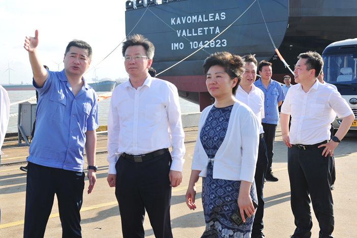 調研中,李忠軍副省長一行深入公司生產一線,只見一艘艘成型的新船正在水下作舾裝調試,船塢內各類船舶正在加緊建造,一派繁忙的船舶建造場景。在座談會上,李忠軍副省長詳細了解我司運行情況,詢問地緣政治、貿易戰(zhàn)等帶來的影響、未來航運市場變化分析以及企業(yè)的應對舉措,勉勵企業(yè)按照新質生產力發(fā)展要求,加快高端化、智能化、綠色化步伐,加快智改數(shù)轉網聯(lián),不斷提升船舶研發(fā)能力和建造水平,進一步增強江蘇高技術船舶與海工裝備先進制造業(yè)集群的國際競爭力。