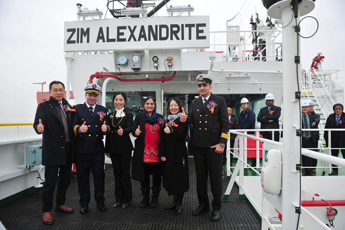 Tracy Hui女士將新船命名為“ZIM ALEXANDRITE”輪,為新船砍纜、擲香檳禮并與嘉賓們登船參觀。汽笛鳴響,祝福新船以及隨船船員航行平安,為船東和租家?guī)順s譽(yù)和財(cái)富。