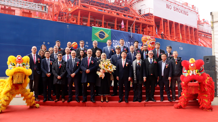 Braskem代表教母Silvia Pires Migueles女士表示:“BRILLIANT FUTURE”輪不僅是船舶建造工程上的奇跡,更是揚子三井與Hartmann雙方敬業(yè)的團隊合作、對市場需求、技術創(chuàng)新的遠見卓識以及所有建造者努力奮斗的結晶;建造過程中每一個細節(jié)、每一個決策都承載著團隊的智慧和汗水。隨后,教母為新船命名,并擲香檳禮。鞭炮、禮花齊響,汽笛共鳴,龍獅共舞。祝福新船、隨船船員航行平安,為船東和租家?guī)砗眠\與財富,為Hartmann、DNV和揚子三井帶來榮耀。