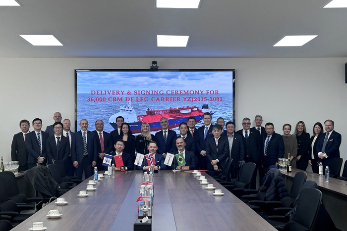 揚子三井代表宋書明先生表示:隨著2025年的到來,揚子三井迎來了第六個生產(chǎn)年頭。自成立以來,揚子三井始終向著成為全球最具競爭力的清潔能源船舶建造基地的目標拼搏努力、砥礪前行。今天交付命名的“BRILLIANT FUTURE”輪是揚子三井首制雙燃料LEG運輸船,作為2025年交付的第一艘船,同時也是揚子三井投產(chǎn)以來交付的第62艘船,這是一個值得紀念的重要里程碑。我想借此機會向Braskem Ms. Silvia、Mr. Hardi以及Ocean Yield Mr. Andreas表示衷心的感謝?;?/span>Hartmann Ulrich Adami先生的信任,我們榮幸的與兩家世界著名公司建立多贏業(yè)務關系。在此,我真誠地感謝各位對揚子三井的認可和鼓勵。感謝Hartmann Ionut Cornea先生、龍葉飛先生及整個Hartmann現(xiàn)場辦始終如一的可靠支持;感謝DNV船級社的嚴謹監(jiān)督、勤勉指導;感謝每一位參與建造此船的揚子三井員工。正因為大家的辛勤工作和無私奉獻,“BRILLIANT FUTURE”輪今天才能展現(xiàn)在我們面前。盡管過去一年面臨諸多艱難挑戰(zhàn),但合作各方的全力支持讓我們持續(xù)成長并超越期待。揚子三井決心致力于持續(xù)提升安全、質(zhì)量和客戶滿意度,為船東和租家打造更安全、更綠色、更高性能的船舶。