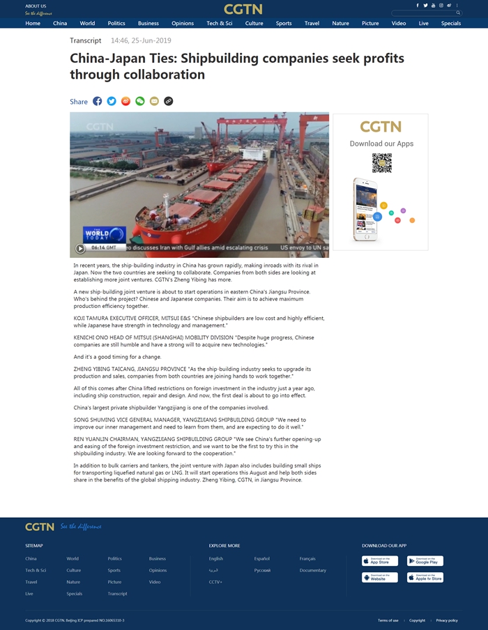 近年來,中國(guó)造船業(yè)迅猛發(fā)展,與日本船企形成了競(jìng)爭(zhēng)?,F(xiàn)兩國(guó)正致力于尋求在造船方面合作共贏,兩國(guó)企業(yè)均期望建立更多合資公司。CGTN的鄭亦冰帶來以下最新報(bào)道。